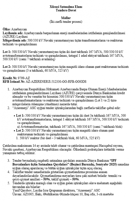 Lot 1: 500/330 kV Nəvahi yarımstansiyası üçün iki dəst təkfazalı 167 MVA, 500/330/10 kV avtotransformatorların təchizatı və quraşdırılması, üstəgəl 1 ədəd ehtiyat təkfazalı 167 MVA, 500/330 kV (cəmi 7 təkfazalı avadanlıq)